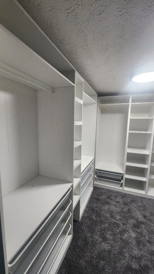 Modular closet systems from IKEA, The Container Store, Modular Closets, and more. Most installs require an in-person consulations so we can measure firfor a perfict fit.